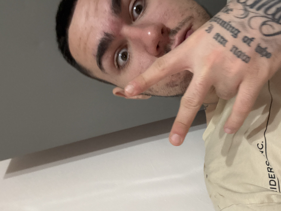 A single male individual, approximately 20-30 years of age, is depicted in a close-up, angled portrait indoors, purportedly located in the city of Yambol, Bulgaria. The subject has short dark hair, prominent eyebrows, and visible stubble on his chin and jawline. His eyes are wide open, looking directly towards the camera, and his mouth is slightly open. A reddish mark is present on his forehead. His left hand, with the back facing the viewer, is raised in front of his face, performing a gesture where the index, middle, and pinky fingers are extended, along with the thumb, while the ring finger is bent. The back of his hand and forearm are extensively tattooed with script and decorative patterns; partially visible script on the hand includes "coming of life" or "coming of hope." He wears a light-colored short-sleeved t-shirt, on which partial text "IDERS INC." is legible. Dark smudges are visible on the left shoulder of his shirt. The background is minimalist, consisting of a plain light-colored wall with a subtle shadow line on the left, and a uniform light gray wall or ceiling in the upper right. Illumination appears even and diffuse.