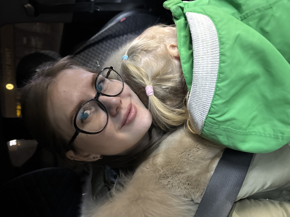 The scene depicts an adult female and a young child inside a vehicle, in the city of Горный, Russia. The adult female, positioned in the foreground, has light hair, wears black-rimmed glasses, a beige fur-collared garment, and a visible seatbelt across her chest. She is looking towards the camera with a slight smile. A young child with blonde hair, styled into two small ponytails secured with a pink and a light blue elastic, rests their head against the adult's chest or shoulder, with their back to the camera. The child is wearing a bright green jacket with a white ribbed collar. The vehicle's interior is dark, and the background visible through the windows is blurred and dark, with distant lights, including one circular yellow light and partially legible reflective text possibly reading "POCKET APP?". A dark, textured vehicle seatback is visible behind the individuals.