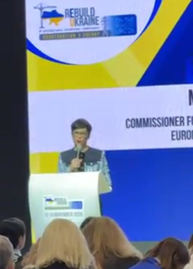 woman at a podium delivering a speech at an event titled "Rebuild Ukraine". The woman is identified on the screen as the "Commissioner for Enlargement and European Cooperation". She is wearing glasses and a dark jacket. The audience is visible in the foreground. After the woman finishes her speech, she receives applause. A man walks to the stage and another man in the audience claps. The background screen displays the word "OFFICIAL".