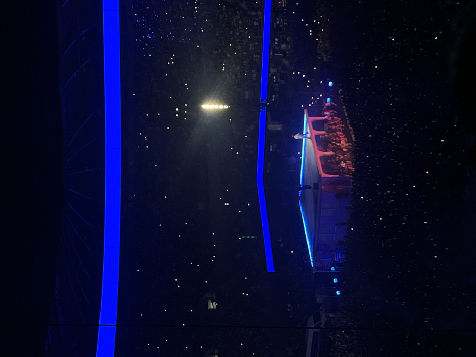 A concert venue with a stage illuminated in neon blue, situated amidst a dark crowd holding up lights. Performers are visible on the platform, while a central spotlight beam shines down. The surrounding arena is filled with specks of light from the audience, creating a starry effect. Two large vertical neon blue fixtures flank the scene.
