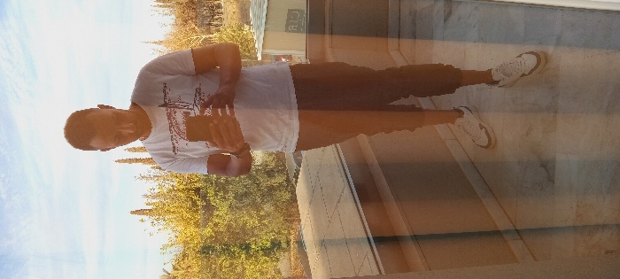 A male subject is depicted in a full-body reflection, standing indoors and facing outwards through a clear glass partition, likely on a balcony or near a large window. The adult male, with short, dark hair, wears a white short-sleeved t-shirt with a dark graphic design on the front, dark-colored long pants, and white athletic shoes with dark trim. He holds a dark-colored smartphone with both hands, looking down towards it, presumably to operate the camera function for this reflective capture. A dark band is visible on his left wrist. A distinct vertical line artifact, characteristic of a reflection on a glass panel, bisects the subject's body. The floor in the foreground, where the subject stands, is light-colored, possibly marble or tiled. Beyond the glass, an outdoor environment is visible under a light blue sky with scattered white clouds. The background features dense, vibrant green and yellow-green foliage from numerous trees and bushes, with several taller, slender, dark-green trees rising above the general canopy. In the far right background, a small, light-colored building with a flat roof and a dark sign is partially obscured by the trees. The image provides no specific architectural details or landmarks to definitively identify a precise location within the city of Fez, Morocco.
