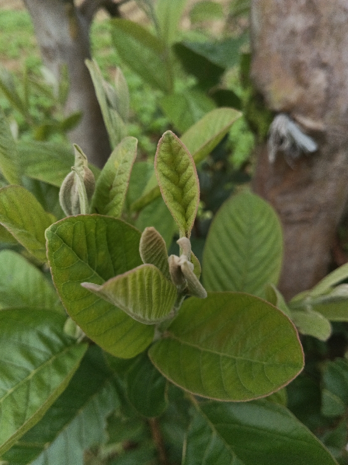 The scene depicts a close-up view of a plant's foliage, located in Banteay Srei, Cambodia. The central subjects are a cluster of green leaves and emerging shoots. The leaves are predominantly shades of green, varying in size, and exhibit visible venation patterns. Several younger, lighter-green leaves and tightly furled shoots display a textured surface consistent with fine pubescence. Subtle reddish-brown coloration is present along the margins of some leaves. In the blurred background, a vertical brown tree trunk or branch is visible on the right side, with a small, irregular, light-grey object attached to its surface. Additional indistinct green foliage occupies the remaining background area. No individuals are present, and no specific actions are depicted beyond the natural growth of the plant.