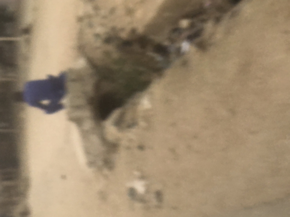 A blurry, rotated image shows a blue object, possibly a glove, near the edge of a light-colored surface resembling concrete or pavement