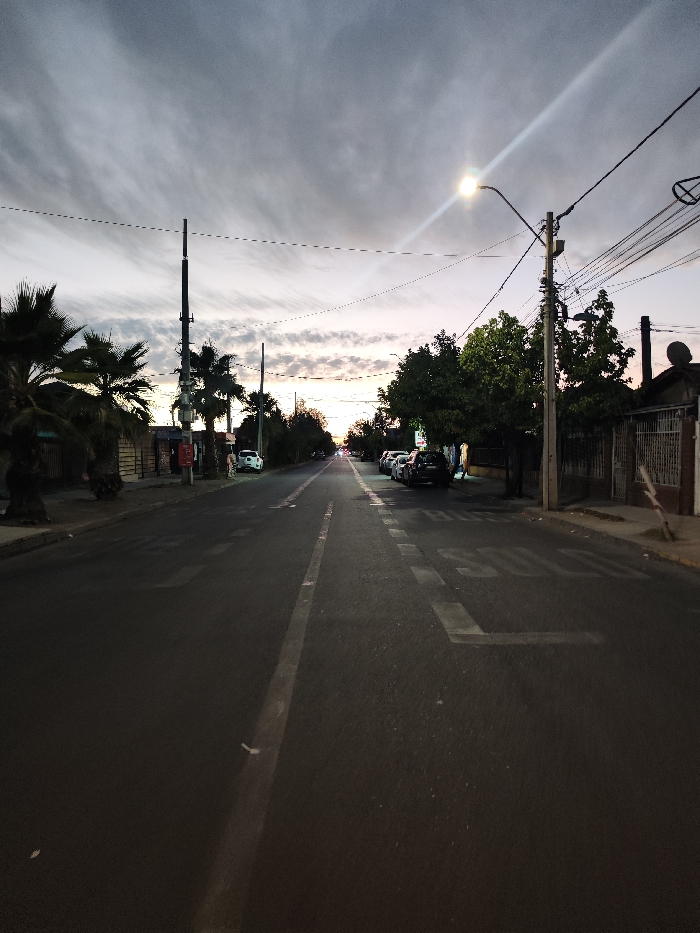 A street scene under a cloudy sky, possibly at dusk. The road stretches into the distance with a solid white line down the middle. Buildings and parked cars line the sides. Trees with leafy foliage are present on one side, while palm trees stand on the other. Power lines crisscross overhead. A street light illuminates the scene. Painted text is visible on the road surface.