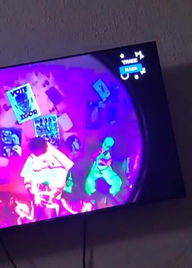 television mounted on a light gray or white wall. The screen is displaying a music video or dance performance with a vibrant, colorful, and psychedelic aesthetic. The lighting is primarily purple and pink, creating a lively atmosphere. There are several figures in the video, some appearing to be dancers, dressed in costumes that are also brightly colored, including green and white. The screen shows the words "HITS NON STOP" in the top left corner and other text in the top right corner. The video cuts out briefly, turning black, then continues. The camera angle is slightly low and angled upward towards the TV.