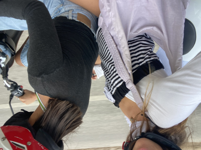 Two individuals are observed riding a dark-colored scooter on an asphalt road in the city of Aegina, Greece. The individual operating the scooter, positioned in front, wears a black, red, and white helmet, a dark gray long-sleeved top, and light blue denim shorts. Their right hand is positioned on the scooter's right handlebar grip, near the brake lever. The passenger, seated directly behind the driver, wears a black helmet with a white chin strap, a white long-sleeved shirt layered over a black and white horizontal striped strapless top, and has brown hair visible below the helmet. A light purple hobo bag is draped over their left shoulder, resting against their torso and lap. A white scarf or bandanna is tied around the passenger's neck. The background consists of a blurred, light gray road surface, consistent with vehicular motion under daylight conditions.