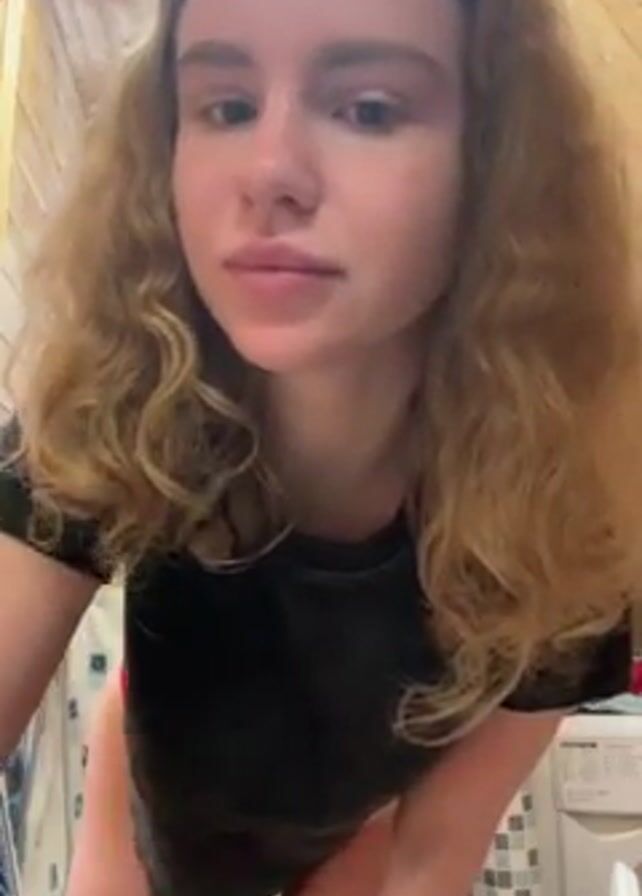 - "A young woman with light skin and curly blonde hair, wearing a black t-shirt and red underwear, stands in a bathroom and washes her face" by FM-jBHPC3, licensed under CC BY 4.0