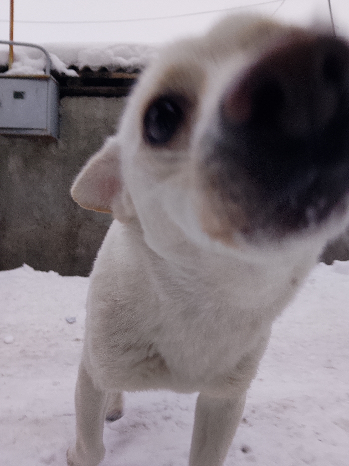 - "The scene depicts a white-furred canid, positioned low and directly facing the camera, within a snow-covered urban environment in Yerevan, Armenia" by FM-q5MXq2, licensed under CC BY 4.0
