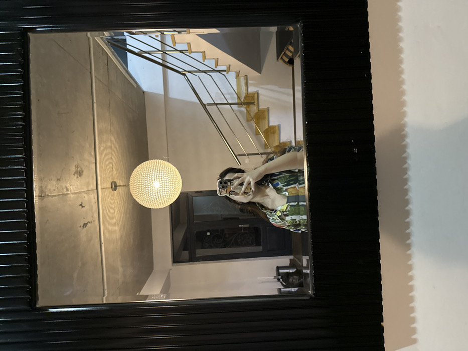 The image depicts a mirror selfie taken indoors. A person, presumed female, with long dark hair and wearing a short-sleeved patterned shirt over a darker top, is reflected from the chest up in a large mirror with a black, fluted frame. The person is holding a smartphone with multiple camera lenses and a decorative case, partially obscuring her face, as she takes the photograph. Reflected in the mirror is an interior space with a gray, unfinished concrete ceiling from which a spherical, beaded chandelier with an illuminated light source is suspended, casting visible light patterns. White walls are present throughout the reflected area. To the left, a dark-colored double door with decorative glass inserts is visible. To the right, a modern staircase with wooden treads and a metallic handrail ascends. A black cylindrical object, possibly a bin or stand, is located near the doorway on the left. Below the staircase on the right, a dark, horizontally striped bench or seating area is partially visible. The exact location within the city of Bakuriani, Georgia, is not discernible from the visual information provided within the image. The immediate foreground shows the bottom edge of the mirror and a white wall, displaying a shadow pattern cast by the mirror's frame.