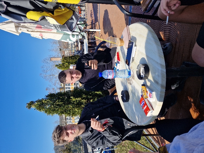 The image depicts an outdoor cafe patio scene in Troyan, Bulgaria, under a clear blue sky and bright sunlight. Two young adult males are seated at a light-colored round table. The male on the left, with curly dark hair and wearing a black jacket, holds a lit cigarette in his right hand and looks towards the viewer. The male on the right, with short dark hair and wearing a dark turtleneck and black jacket, is engrossed in a black smartphone held in both hands. The lower right portion of the frame shows a bare thigh in dark shorts and a hand holding a lit cigarette, indicating at least one other individual at the table who is also smoking. On the table, items include a plastic bottle of DEVA brand water, two black ashtrays containing cigarette butts, a red Marlboro cigarette pack, a yellow lighter, a white cigarette pack, a black smartphone, a light pink wallet or clutch, a pair of sunglasses, and a plastic cup with a straw containing a light brown beverage. The background features a tall, conical evergreen tree, behind which is a multi-story building with light-colored facades and numerous windows, possibly an institutional or residential structure. Bare deciduous trees and a brick chimney are also visible further back, with distant hills or mountains on the horizon. To the right, large, folded cafe umbrellas with white, green, and yellow panels are visible, along with additional empty tables and chairs. The ground surface of the patio is a dark brown wooden decking.