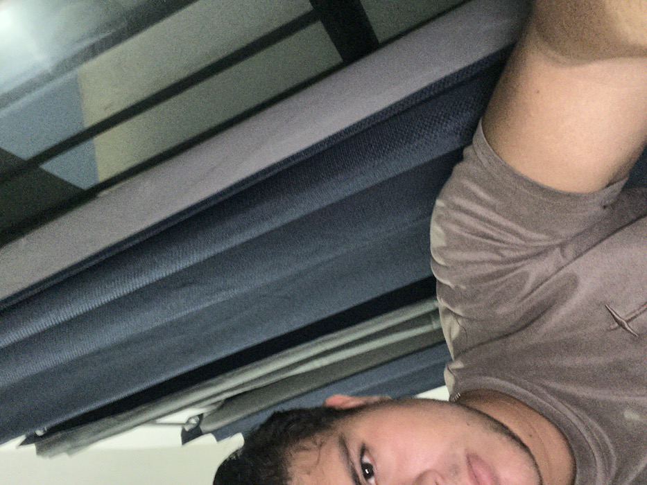A male individual is partially depicted in a close-up indoor shot, positioned in the lower-left portion of the frame in the city of Komchén, Mexico. His left eye, nose, and mouth are visible, along with his left shoulder and bicep. He has dark hair, light skin, and stubble on his chin and jawline. He is wearing a dark grey short-sleeved t-shirt with a small, light-colored, stylized cross design on the left chest area. His left arm extends diagonally out of the frame towards the lower right. The background consists of vertical elements: a light-colored wall or surface on the far left, followed by what appears to be folded grey fabric. To the right, a dark blue, vertically textured curtain is prominent, and further right, reflections of multiple vertical light-colored bars are visible against a darker background, suggesting a window or glass panel. The scene is illuminated by ambient indoor lighting.