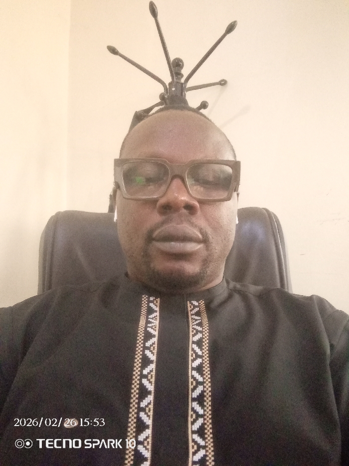 The scene depicts an adult male seated indoors within the city of Lokoja, Nigeria