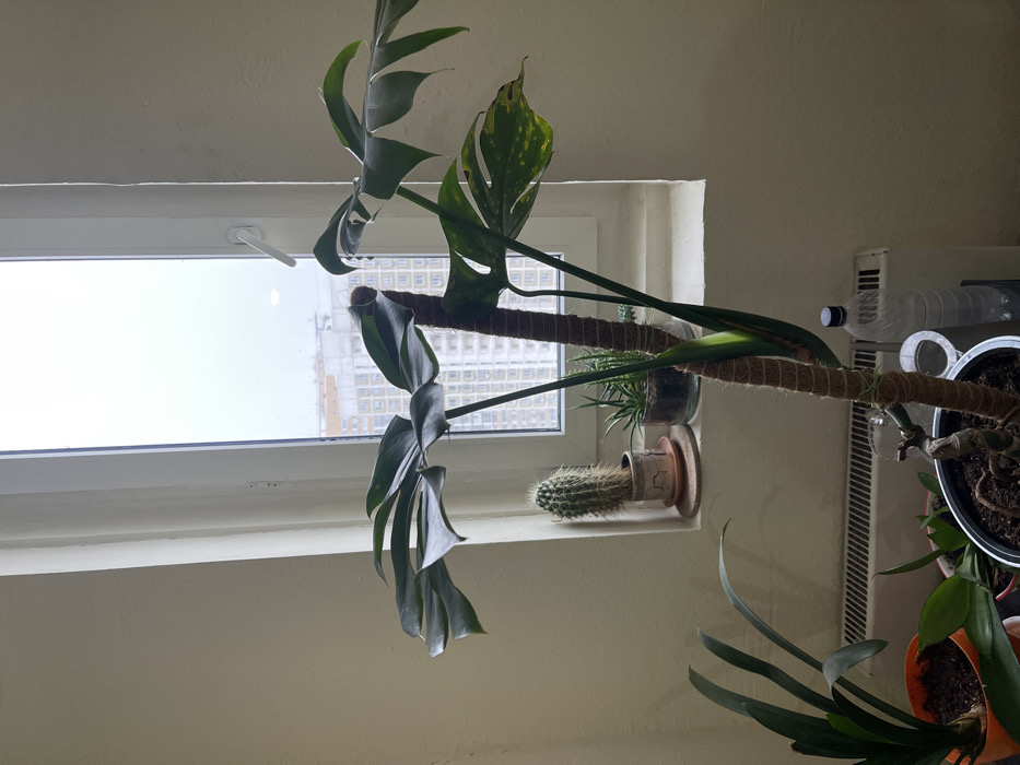 The image displays an indoor residential setting, likely an apartment, looking out onto an urban landscape consistent with the city of Khimki, Russia. In the foreground and midground, several potted houseplants are arranged. A prominent, large Monstera deliciosa with dark green, fenestrated leaves occupies the center, its main stem wrapped around a brown coir support pole and secured with green ties. One leaf on the right shows yellow discoloration and spotting. This plant is in a black pot. To its left, on a white windowsill, a tall, spiny cactus is situated in a patterned terracotta-colored pot resting on a round saucer. Next to the cactus, a smaller succulent-type plant grows in a clear glass pot. Below the windowsill, a white horizontal radiator is visible. Further left, partially out of frame, a plant with long, dark green leaves grows in an orange pot. Another small plant with a gnarled stem is in a black pot below the main Monstera. Two transparent plastic bottles, one capped and one uncapped, rest near the base of the Monstera and the radiator. A clear glass object is also partially visible. Through the white-framed window, an overcast sky is visible above numerous modern, multi-story residential buildings. These light-colored apartment blocks with many windows are characteristic of dense urban development in Khimki. The interior walls are a plain, light, neutral color. No individuals are present in the scene.