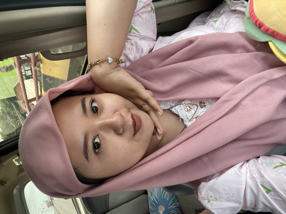 A woman with fair skin is wearing a pink headscarf and resting her hand on her face. She has dark eyes and eyebrows, and her lips are slightly parted. She is wearing a gold bracelet with a heart charm. The background suggests she is in a car, and she is wearing a pink outfit with a floral pattern. There is a plush, colorful object near her right shoulder.