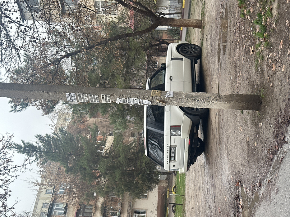 The image depicts an outdoor urban scene in Tashkent, Uzbekistan, under an overcast sky. A white Range Rover SUV, bearing Uzbek license plate 481 BAR 02, is parked on a muddy, unpaved surface in the center-right of the frame. The vehicle's rear and right side are visible, with dark-colored wheels and dual exhaust tips. In the immediate foreground, slightly right of center, a concrete utility pole stands vertically, heavily plastered with numerous paper advertisements, primarily in Cyrillic script, some displaying words like "КУПЛЮ" and "ПОКУПАЕМ" alongside phone numbers. The ground is predominantly dark brown, muddy earth with visible puddles, scattered fallen leaves, and sparse patches of green grass. To the far left, a yellow, semi-circular object (possibly part of a tire) is visible on a greener patch of ground. Behind the vehicle and the pole, several deciduous trees with bare branches and some remaining withered leaves are interspersed with green coniferous trees. In the background, multi-story residential buildings with multiple windows and balconies are visible, constructed with light-colored facades. No individuals or discernible actions are present within the frame.