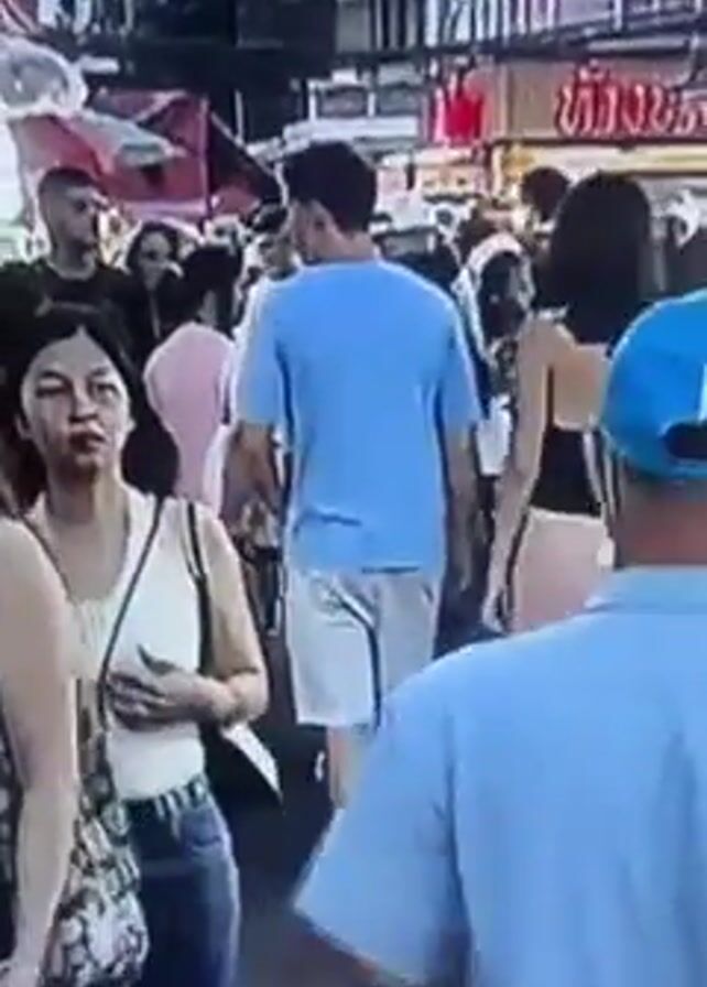 crowded outdoor market scene. The environment is bustling with many people walking through the market. People of various ethnicities are present, including Asian and Caucasian individuals. Most people are dressed casually. The market stalls are visible in the background, with various items on display. The overall impression is one of a lively, busy commercial setting.