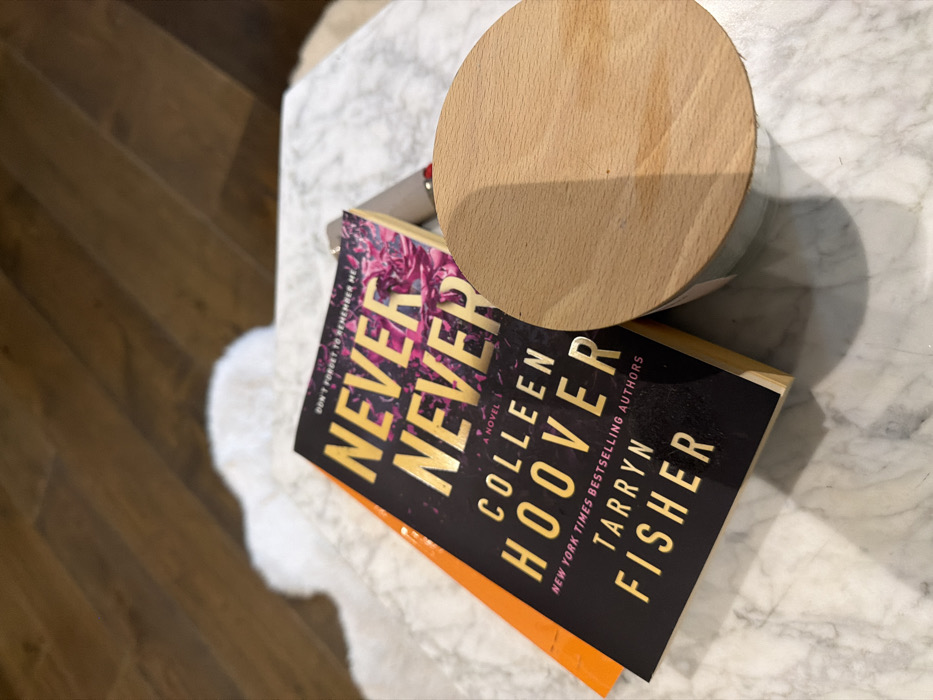 The image displays an overhead-angle view of several stationary objects on a multi-textured surface. A book titled "NEVER NEVER" by Colleen Hoover and Tarryn Fisher, featuring a black cover with gold lettering and a pink/purple floral design, rests face-up. Partially visible beneath it is an orange-colored object, possibly another book or a bookmark. To the right of the book is a cylindrical object with a light-colored wooden lid, resembling a candle or a container. These items are positioned on a light-toned marble or marbled surface. A segment of a white, fluffy textile or rug is visible under the marble surface to the left and rear. The background reveals a dark brown wooden floor with horizontal planks. Shadows are cast by the book and the cylindrical object onto the marble surface, indicating a light source from the upper left. No people are visible. The scene is indoors. The image does not contain sufficient visual information to determine its precise location in Monterrey, Mexico.