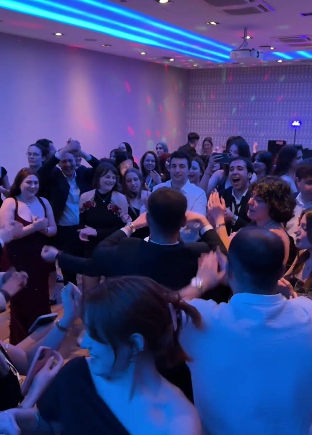 group of people dancing and celebrating at what appears to be a wedding reception or similar formal gathering