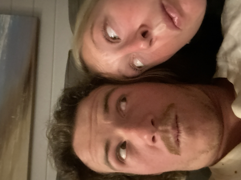 The image depicts two light-skinned individuals, a male on the left and a female on the right, photographed indoors in Bulli, Australia. The male has dark, wavy hair and a light brown mustache, with a faint stubble. He is wearing a light-colored, possibly cream or white, collared shirt with small dark polka dots. His eyes are rolled upwards and to his right. The female, partially visible, has blonde hair and appears to have a flushed complexion, particularly on her cheeks and nose. Her eyes are also rolled upwards, but to her left. Both individuals appear to be looking at something above and between them, with expressions suggesting a shared reaction. They are positioned closely together, potentially reclining. In the background, a light-colored wall with horizontal paneling is visible, along with a framed artwork featuring muted blues, whites, and browns. The scene is illuminated by ambient indoor lighting.