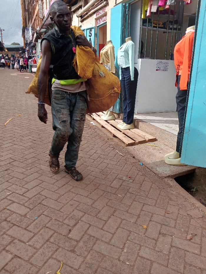 The image depicts a daytime street scene on a commercial thoroughfare in Nyeri, Kenya. The ground is paved with reddish-brown interlocking bricks laid in a herringbone pattern. In the mid-ground, an adult male with dark skin and a lean build walks towards the viewer, slightly to the left of the frame's center. He wears a dark sleeveless vest over a light-colored t-shirt, ripped blue jeans, and open-toed sandals. A neon green fanny pack or belt is visible around his waist, and he has a dark bracelet on his left wrist. He is actively carrying two large, yellowish-brown sacks, draped over his left shoulder and behind his back. To the immediate right, a shop entrance features light blue metal doors, partially open. Three headless mannequins stand on pale footwear bases on the ground or just inside the entrance. One mannequin wears a light yellow long-sleeved shirt and patterned bottoms, another wears a light blue long-sleeved collared shirt and dark trousers, and a third, partially obscured by the blue door, wears a bright orange long-sleeved top and dark trousers. Wooden pallets are visible on the ground in front of the shop entrance. Above the shop, a sign reads "WELCOME KINYOZI" (barbershop/hair salon in Swahili), and a partially visible sign below it contains the word "SALES." An open concrete drainage channel runs along the right edge of the paved area. In the background, the street extends, lined with multi-story commercial buildings, some with reddish-brown facades. Several individuals are visible walking further down the street, indicating activity. The sky is overcast or partly cloudy.