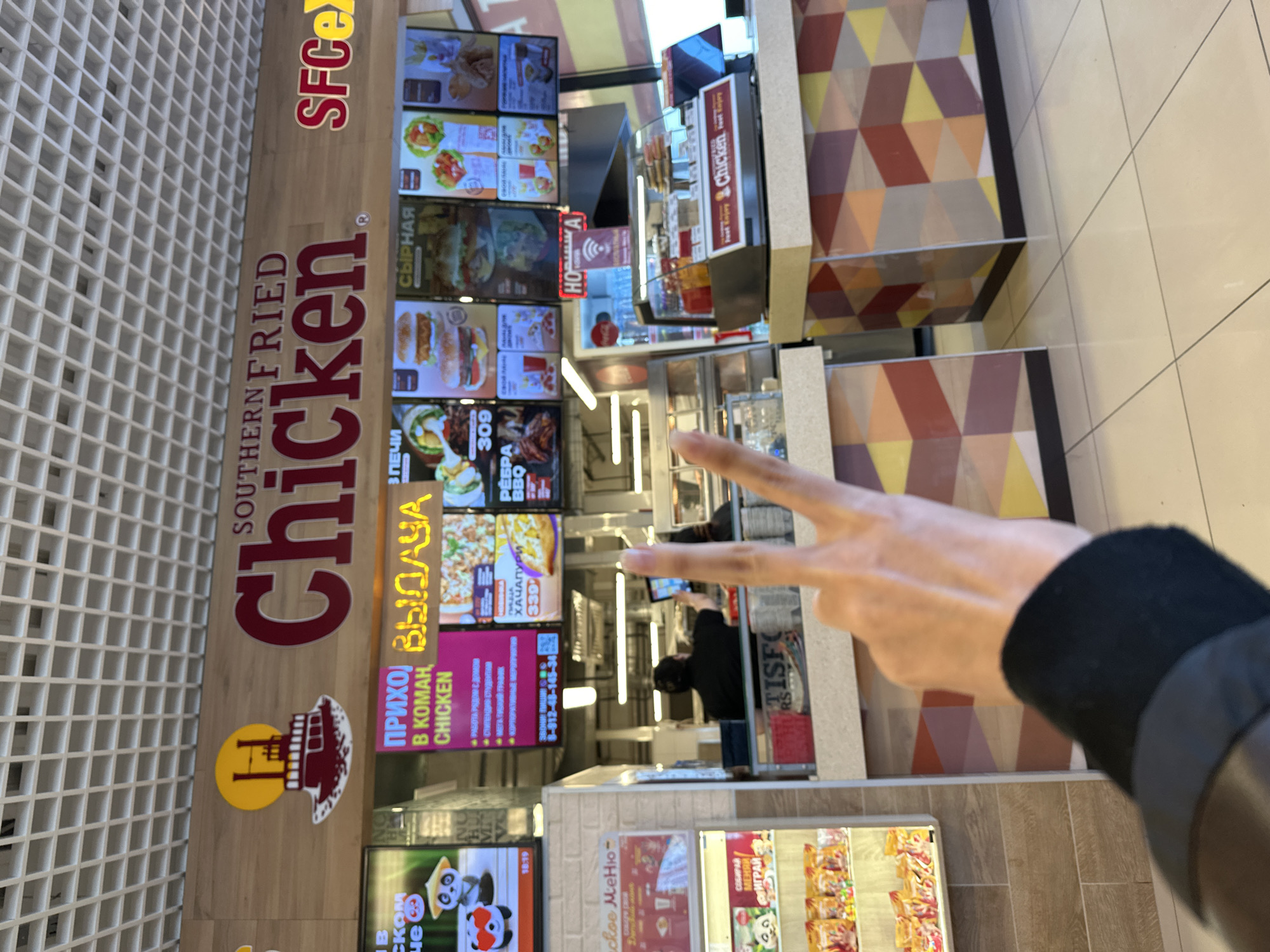 front of a Southern Fried Chicken (SFC) restaurant. The restaurant signage displays the name in English and a logo of a tower with a yellow sun behind it. The menu is prominently displayed with images and prices, partially in Russian. A hand makes a peace sign towards the interior of the restaurant, where a person can be seen behind the counter. A display case of snacks is near the hand. The location is Krylovo, Russia.