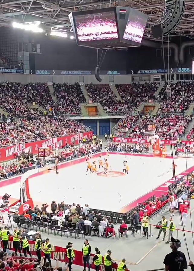 high-angle view of a basketball game in a packed arena. The court is well-lit, and teams in orange and blue jerseys are playing. The stands are filled with spectators, mostly wearing red, creating a sea of color. Banners with the team name are visible around the arena. Camera operators and personnel surround the court. Large screens hang above the court, displaying game information and replays. The atmosphere is energetic, with people cheering and moving around.