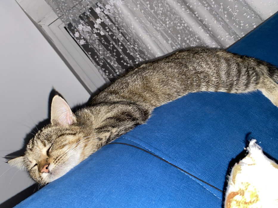 In an indoor setting within Sredkovets, Bulgaria, a domestic tabby cat with brown and black striped fur is depicted sleeping. The cat's head is tilted back, resting against a textured blue upholstered surface, likely a piece of furniture such as a couch or chair. Its eyes are closed, and its muzzle is slightly upturned. The cat's body extends downwards and to the right, draped over the blue material. A thin black line, possibly a seam or cable, is visible on the blue upholstery near the cat's neck. In the background, a white window frame is partially visible to the right, covered by a translucent white curtain featuring a repeating pattern of white floral or branching elements. A portion of a yellow and white fluffy object is visible in the lower-left corner of the frame.