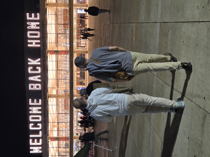 Outside the Charles Bronfman Auditorium, a brightly lit sign reads "Welcome Back Home." People mill about near the entrance. Two men stand on the pavement in the foreground. One wears a gray shirt and khaki pants, while the other dons a white hooded sweatshirt and light-colored pants. Their shadows stretch onto the concrete. The building behind them has many illuminated windows.