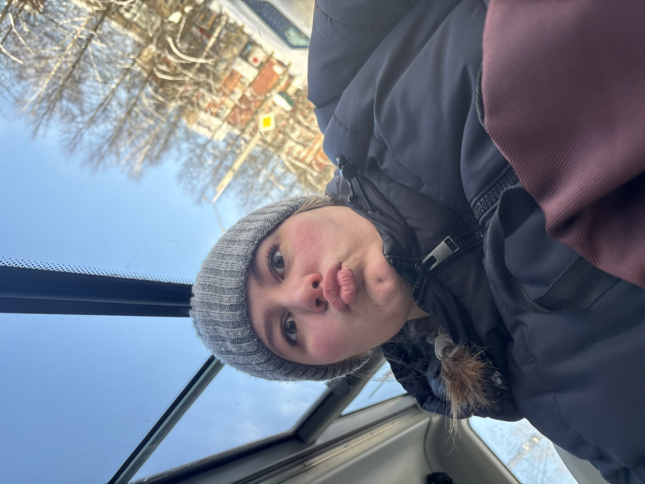 A female individual is captured in a selfie within a vehicle in Chaikovsky, Russia. She wears a grey knit beanie and a dark blue puffer jacket, displaying a playful expression with pursed lips and wide eyes. Her braided hair is visible on the left. Above, a partially open sunroof reveals a clear blue sky. The exterior, visible through the side window, shows bare deciduous trees, a multi-story building with a reddish-brown facade, and a yellow diamond-shaped road sign. A white vehicle is partially visible to the right, and traces of snow or ice are present on the ground.