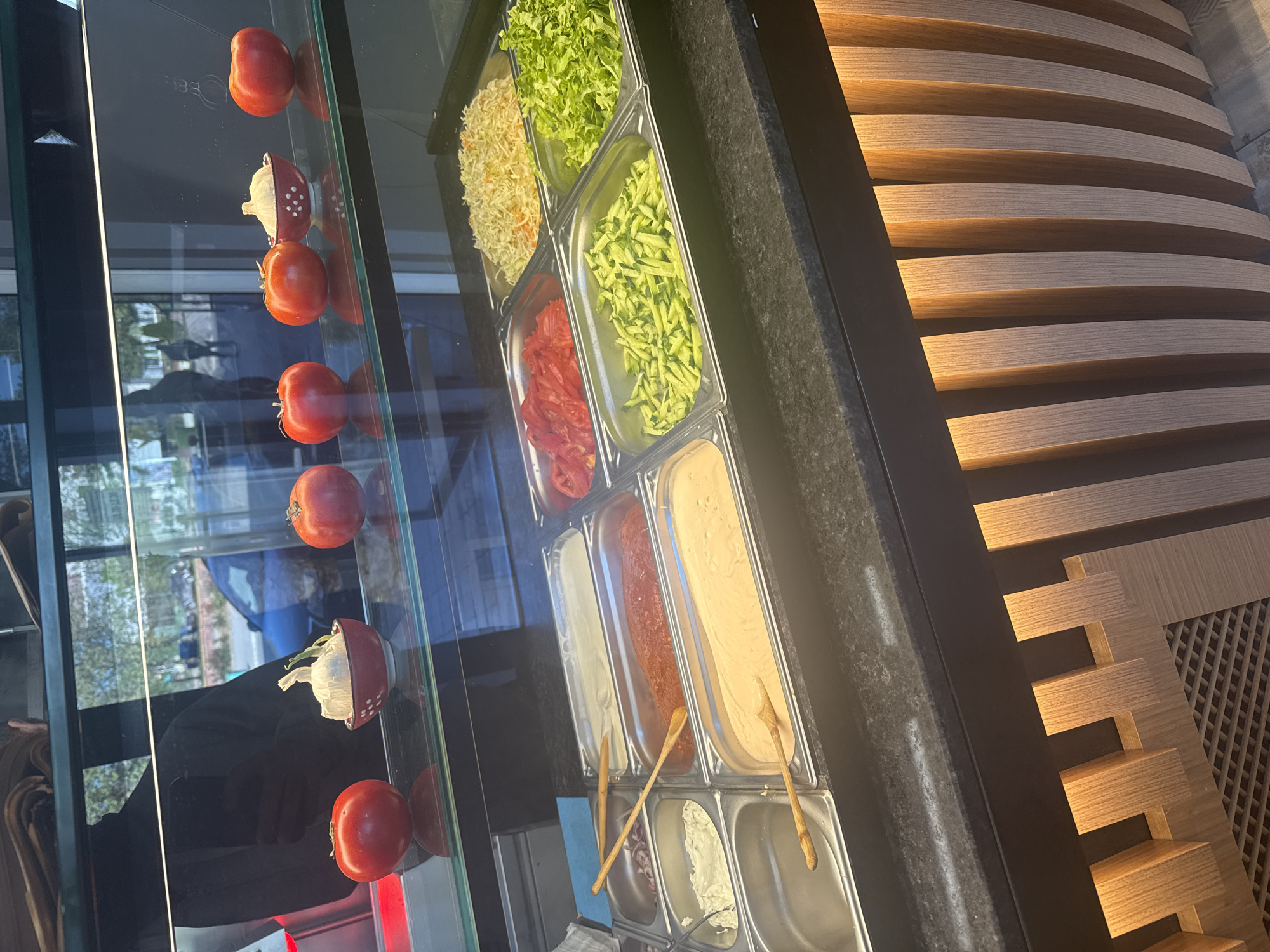 counter in Lukovit, Bulgaria, likely in a food service establishment. The counter features a display case with various food items. Behind glass, there are rows of tomatoes and decorative halved tomatoes filled with white filling, possibly garlic. To the right of the tomatoes, metal containers hold shredded lettuce, shredded cabbage, sliced cucumbers, and sliced tomatoes. Further to the right, metal containers hold different sauces, with wooden spoons inserted into them. The countertop appears to be a dark, speckled material. To the right of the counter, there is a wall decorated with horizontal wooden slats. The image is taken at an angle, and reflections in the glass display case show an outdoor scene, including vehicles and buildings, partially obscured by the reflection of a person taking the photo.