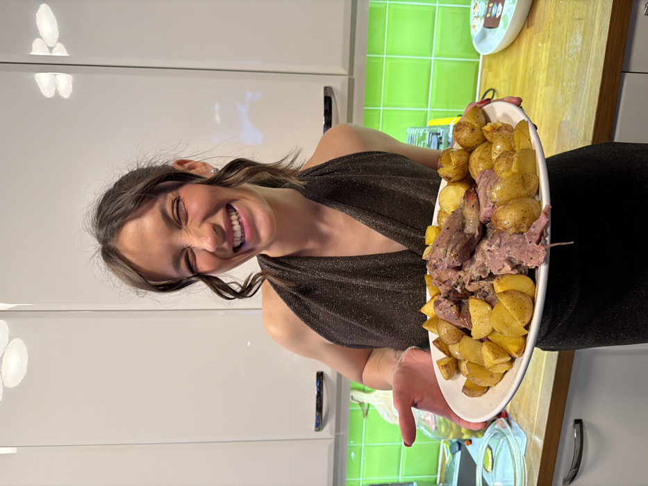 A female subject, estimated to be in her 20s or 30s, is centered in a modern kitchen in Korolyov, Russia. She has brown hair, partially pulled back with wavy strands framing her face, and is wearing a dark, possibly metallic or glitter-fabric, halter-neck top. The subject is smiling broadly, with her eyes squinted almost closed, indicative of laughter or strong amusement. She is holding a large white oval platter with both hands, presenting it towards the viewer. The platter contains a substantial serving of roasted meat, appearing to be pork or ham, cut into pieces, surrounded by numerous golden-brown roasted potatoes, some whole and some halved. The background of the kitchen features white, glossy upper cabinets equipped with dark handles. Beneath these cabinets, a bright green tiled backsplash is visible. A light-colored wooden countertop spans the lower portion of the frame. On the far left of the countertop, a clear plastic container with a lid is partially visible. On the far right, a white oval dish with a decorative, possibly patterned, rim is partially visible on the countertop. The scene is brightly and evenly lit.