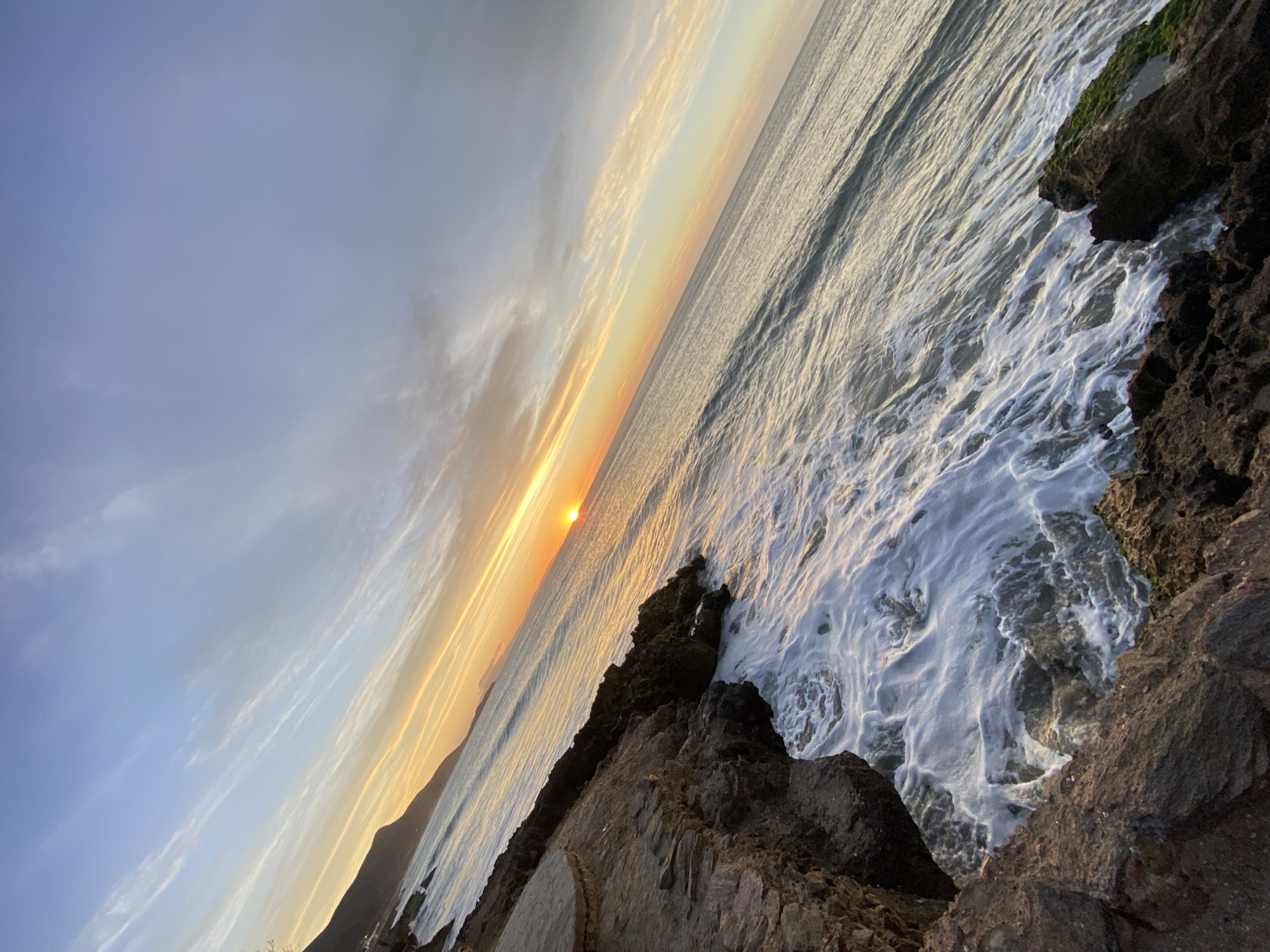 sunset over the ocean in Juan Griego, Venezuela, as seen from a rocky coastline