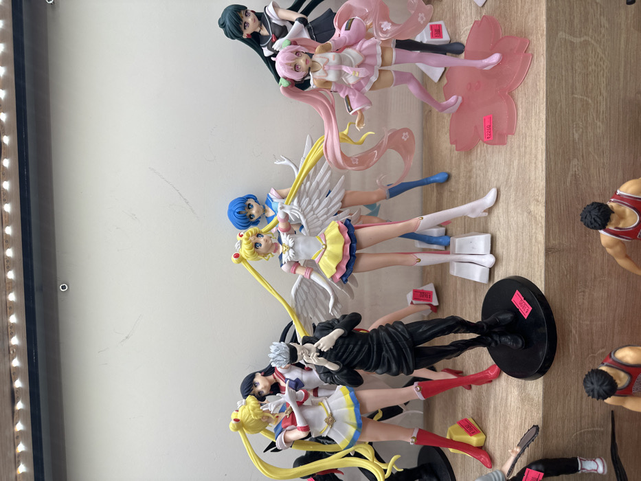 The image depicts a retail display shelf showcasing multiple anime and manga collectible figures within a store located in Küçükçekmece, Turkey. The figures are arranged on a light wood-grain surface, with a plain white wall as the background. A strip of LED lighting runs along the top edge of the display. From left to right, the prominent figures include: * A "Sailor Moon" character (Sailor Moon) with long blonde pigtails, wearing a white, blue, and red sailor uniform with red boots, standing on a gold-colored base. * Adjacent to her, a "Sailor Mars" figure with dark hair, wearing a white and red uniform, with red heels. * Centered, a "Jujutsu Kaisen" figure of Satoru Gojo, depicted in a black outfit with a white blindfold covering his eyes, his hands positioned near his face, standing on a black circular base. * Another "Sailor Moon" figure, similar to the first, but featuring large white wings and a white uniform with yellow, blue, and pink accents, standing on a white rectangular display support. * Next to her, a "Sailor Mercury" figure with short blue hair, wearing a blue and white sailor uniform with blue boots. * To the far right, a "Hatsune Miku" variant figure with long pink pigtails, dressed in a pink outfit with a skirt and pink boots, standing on a translucent pink base shaped like a cherry blossom. A red price tag with white text "¥2250" is visible on this base. * Behind the pink-haired figure, another female figure with long dark hair, wearing a dark school-style uniform. Several red price tags with white text are visible on the shelf and bases, indicating items for sale. Below the main display shelf, the upper portions of two additional male figures, possibly basketball players, wearing red jerseys, are partially visible on a lower shelf. The figures are static, posing as characters from various media.