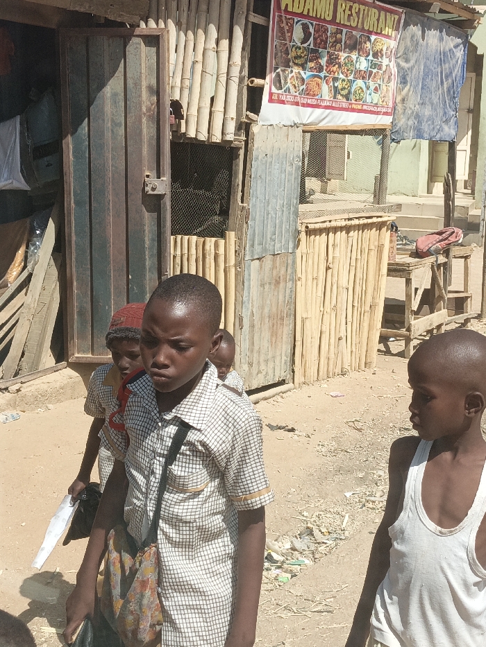 In Hotoro North, Nigeria, a daytime scene depicts four young boys on a dirt path in front of a series of simple structures. The central figure is a young boy with dark skin and short dark hair, wearing a light-colored plaid short-sleeved collared shirt. A dark strap crosses his chest, leading to a patterned fabric bag hanging near his hip. He holds a black object and a piece of white paper in his left hand. His gaze is directed slightly downwards and forward. Immediately behind him, to his left, is another young boy with dark skin, wearing a reddish cap and a light-colored shirt with a red strap over his shoulder. Partially visible behind the central boy's right shoulder is a third young boy, also with dark skin and short hair, wearing a light-colored shirt. To the right in the foreground, another young boy with dark skin and very short hair stands, wearing a white sleeveless undershirt and light-colored shorts. He looks towards the left. The ground is dry, light-brown dirt with scattered debris, including plastic and paper. On the left, a dark metallic door, possibly corrugated, with a visible latch, is slightly ajar. Adjacent to this, a structure features vertical bamboo poles and corrugated metal sheets. Above this, a white banner with red text reads "ADAMU RESTAURANT" and displays multiple images of food dishes. A blue tarp hangs behind this sign. Further back, a light-green building with steps is visible. To the right of the central structures, a wooden table or stand holds a single red shoe or sandal. Strong sunlight casts clear shadows across the scene.
