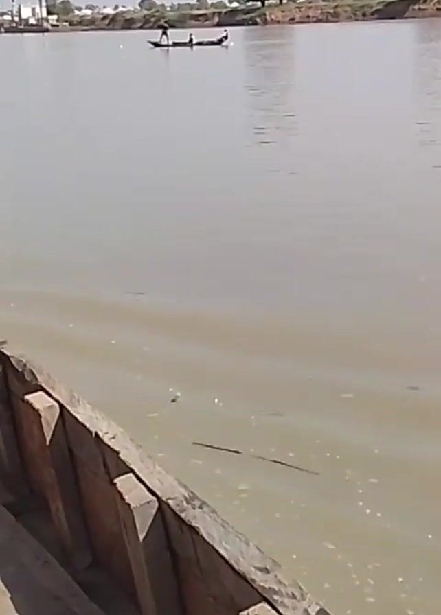 calm river scene with a wooden boat in the foreground and a smaller boat with two people in the distance. The water appears murky, and there are some ripples on the surface. The bank across the river has vegetation and what appears to be a settlement or industrial area. The sky is clear and light in color. The camera appears to be on a boat or dock.