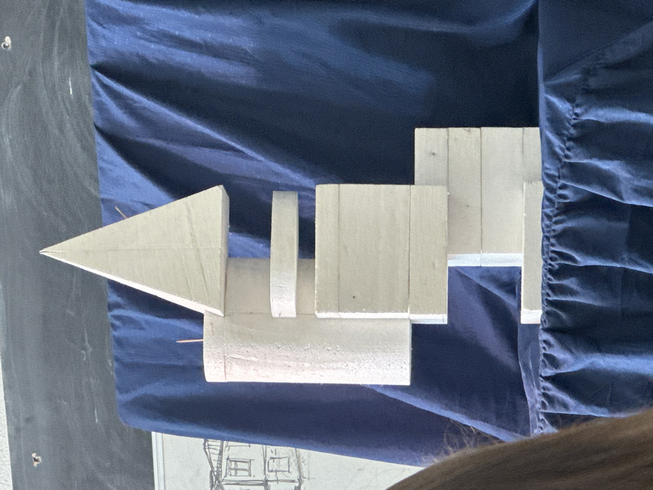The scene, located in Varna, Bulgaria, depicts a still-life arrangement set against a dark blue fabric backdrop. Central to the image is a multi-component sculpture composed of white geometric solids, appearing to be crafted from a lightweight material such as foam or cardboard. The sculpture consists of a tall, cylindrical form positioned on the left, and a vertical stack of shapes on the right. The right stack includes, from bottom to top, a rectangular base, three progressively smaller rectangular blocks, a flat circular disk, and is capped by a pointed pyramid. Small, thin wooden pegs, likely securing components, are visible: one atop the cylindrical form and another near the base of the pyramid. The dark blue fabric serving as a backdrop is wrinkled and draped. Below the geometric sculpture, the same dark blue fabric is visible, appearing ruffled as it covers a surface, possibly a table or stand. To the left of the sculpture, a white sheet of paper with a black-and-white architectural line drawing of a building with multiple windows is partially visible. Above this drawing, a dark, featureless surface, possibly a chalkboard or wall, is present. In the lower-left foreground, the out-of-focus shoulder and upper arm of an individual with light brown hair are discernible, indicating the presence of an observer or participant in the immediate vicinity. No explicit actions or interactions beyond passive observation are depicted.
