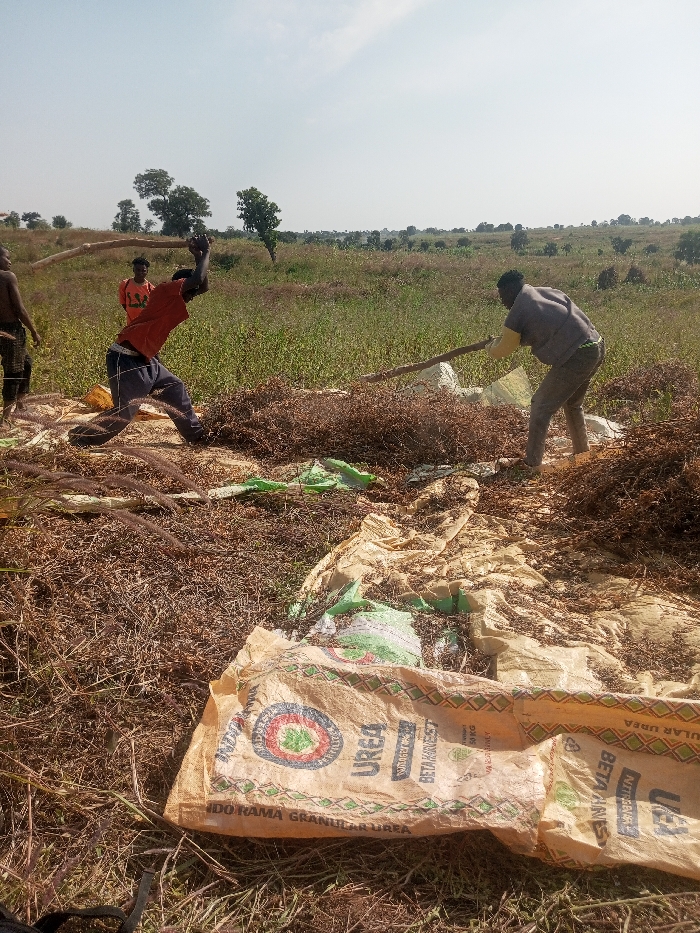 In an outdoor agricultural field in Kakau, Nigeria, four adult males are engaged in crop processing under a clear sky. In the foreground, two men are actively threshing dried plant material, possibly legumes, spread across the ground on several woven polypropylene sacks. The man in the center, wearing a red short-sleeved shirt and dark pants, swings a long wooden stick overhead, positioned with his body angled left. To his right, another man in a grey long-sleeved shirt and dark pants, wearing light-colored gloves, is bent over, also using a long wooden stick for threshing. Partially visible on the far left is a shirtless man in dark pants. In the background, between the two active threshers, another man in an orange shirt stands observing. The ground is covered with extensive piles of dried reddish-brown plant matter. Several light-colored sacks are visible, one prominently displaying "UREA" and "INDO RAMA GRANULAR UREA." The background features a vast expanse of green and brown vegetation, indicative of farmland, with scattered trees under a light blue sky with minimal cloud cover.