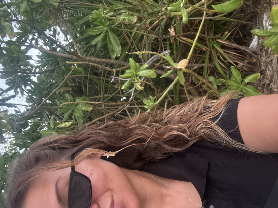 This image captures a partial view of an individual in an outdoor, tropical setting within Ukulhas, Maldives