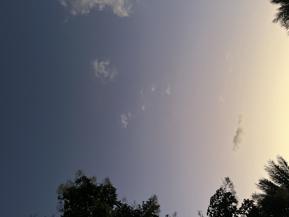 A low-angle shot captures a partly cloudy sky. The sky transitions from a darker blue on the left to a pale, almost yellow hue on the right, suggesting either dawn or dusk. Sparse, puffy clouds are scattered across the center. The bottom edge is framed by silhouettes of trees, their dark foliage contrasting sharply with the brighter sky. Palm fronds extend into the scene from the upper right corner.