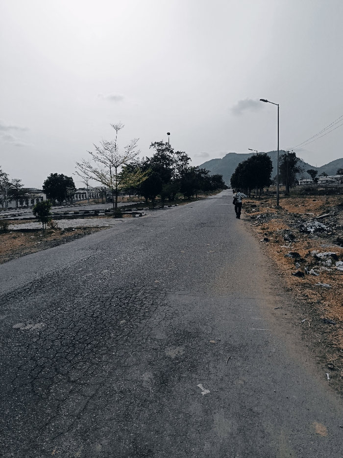 This image captures a long shot of a cracked asphalt road in Rafin Pa, Nigeria, under an overcast sky. A single adult male, viewed from behind, walks away from the camera on the right side of the road, wearing a patterned shirt and dark trousers. The road, showing significant cracking and minor debris, extends into the distance, bordered on the right by a dry, unkempt dirt shoulder with sparse vegetation and scattered refuse. A tall black streetlamp with a single fixture stands upright on the right side of the road, roughly mid-frame. On the left side of the road, a wide, paved area, possibly a disused parking lot, is visible, defined by concrete curbs. This area contains several trees, including one with distinctive bare, upward-reaching branches and scattered small-leafed trees. Beyond this paved area, a line of denser, darker-foliaged trees runs parallel to the road. In the mid-ground, behind these trees, several multi-story buildings with light-colored facades are discernible. The background features a range of dark green mountains under a pale grey, hazy sky with faint cloud formations. The scene is sparsely populated, with no other individuals or vehicles visible.