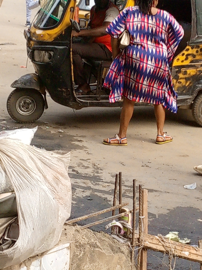 A woman in a patterned dress and sandals stands near a black and yellow auto-rickshaw. The driver sits inside. A large, white bag is on the left, partially obscuring construction materials. The street is marked with water stains. A small portion of another person is visible in the background.