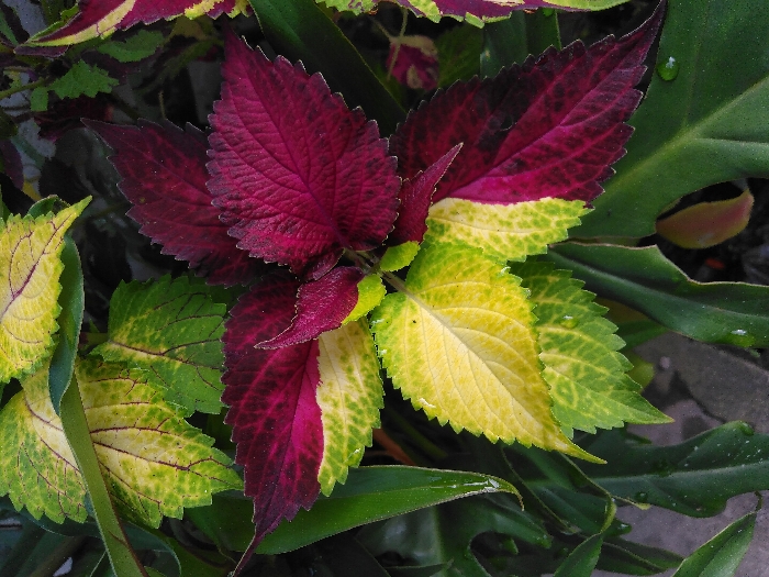 This image captures a close-up view of variegated plant foliage located in Los Ramírez, Mexico. The scene features a dense cluster of broad, serrated leaves exhibiting striking color variations. Dominant colors include dark magenta, bright yellow, and multiple shades of green. Several leaves display distinct bicolor patterns, with sharp transitions between magenta and yellow-green sections. Other leaves are either predominantly dark magenta with visible darker veins, or primarily yellow with green venation and margins. Background elements consist of obscured solid dark green leaves, some bearing small water droplets. A faint, indistinct gray surface, possibly pavement, is visible in the lower left corner behind the foliage. No individuals or active subjects are present.