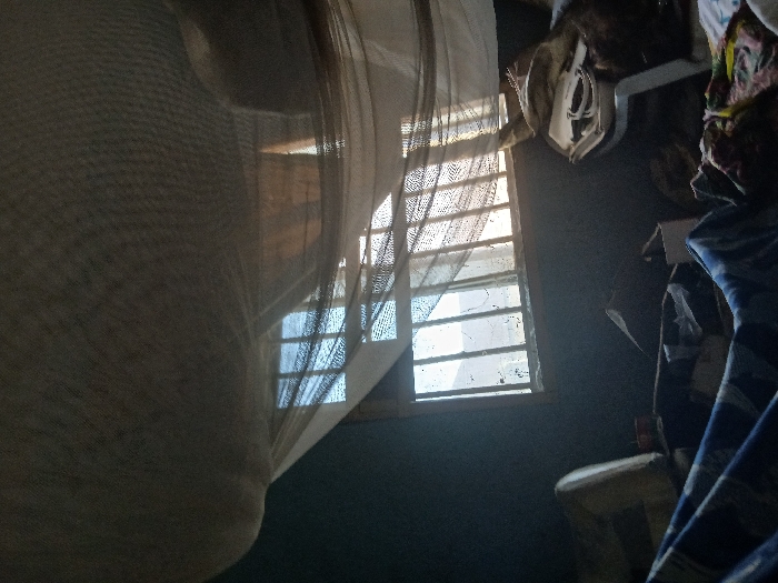 An indoor scene is depicted within a room in the city of Unknown, Unknown, illuminated primarily by natural light entering through a central rectangular window. A light-colored, loosely draped mesh fabric, likely a mosquito net, hangs from above, partially obscuring the upper window area and extending across the ceiling. The window features vertical security bars and a visible layer of dirt or dust on the glass. Through the window, an indistinct outdoor scene is visible, suggesting daylight. To the left of the window, a dark wall is visible, along with a portion of a light-colored upholstered object, possibly a chair or sofa. The foreground and lower portions of the room are cluttered with various objects. A blue and white patterned fabric occupies the lower left. In the mid-right, a white plastic stool or small table holds a white object, possibly a bag, alongside other indistinct dark items. Further right and in the foreground, a brightly colored, patterned fabric is partially visible. No individuals are present in the scene.
