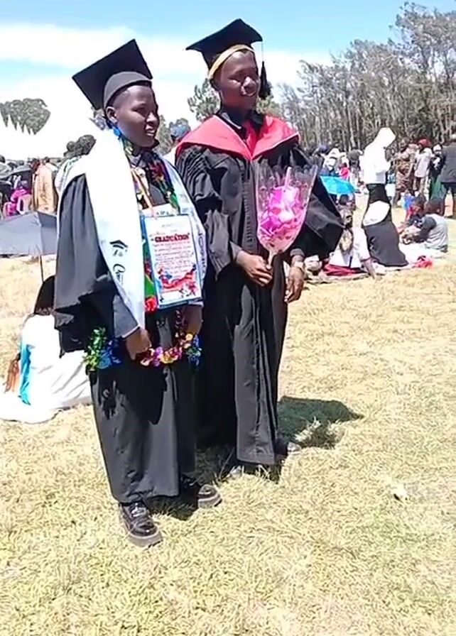 Two young people are standing in an open, grassy field, posing for a photo. They are dressed in graduation gowns and caps. The person on the left is wearing a white stole decorated with colorful leis and holding a framed certificate. The person on the right is holding a bouquet of pink flowers and wearing a red-trimmed gown. There are other people visible in the background, some seated and some standing. A white tent can be seen in the distance. The weather appears sunny and clear.