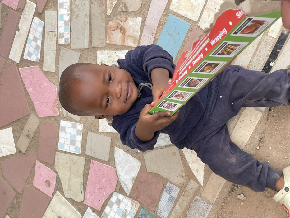 The image captures a young child, appearing to be a toddler, seated on the ground in Jos, Nigeria. The child has dark skin and short, dark hair, wearing a dark blue long-sleeved top and matching dark blue pants, both showing visible dust and dirt. A light-colored Croc-style shoe is visible on the child's left foot. The child holds a red and green cardboard box horizontally with both hands, extending it forward and slightly upwards. The visible side of the box features text such as "For Cooking," "Freezing," and "Wrapping," accompanied by several small images of cooked food items. The box appears torn or damaged at its right end. The child displays a faint smile and looks slightly downward and to the right. The ground beneath the child is an irregular mosaic crafted from various colored broken tiles, including shades of pink, light brown, white, light blue (some with checkered patterns), and grey, interspersed with exposed earth and concrete fragments.