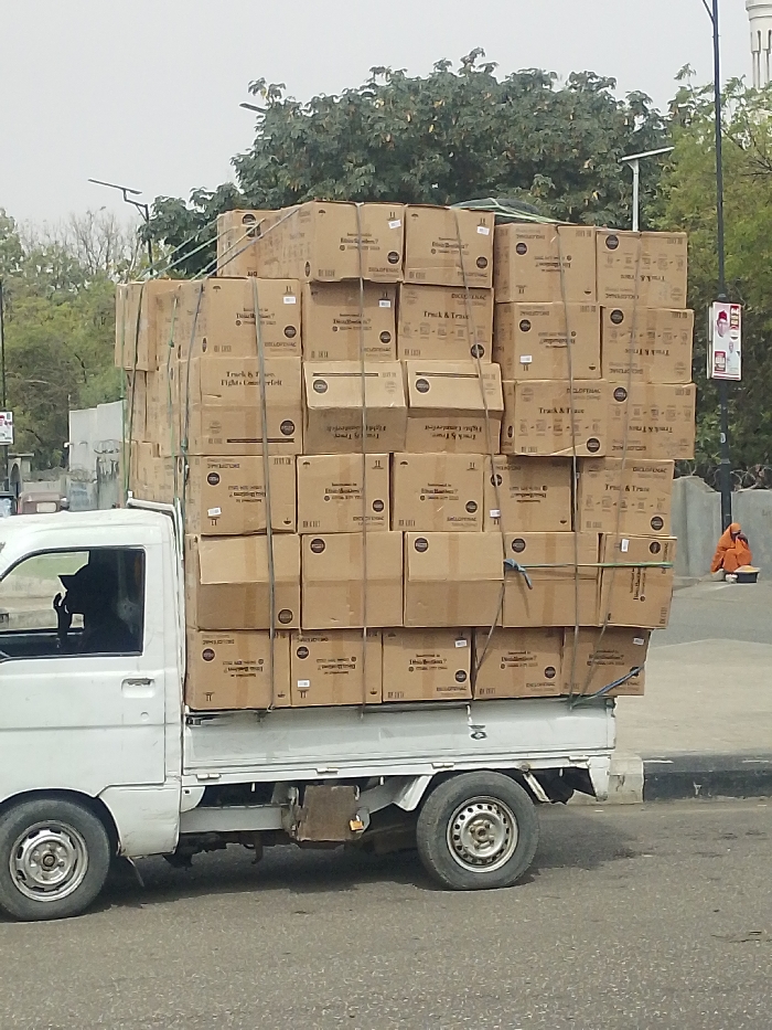 - "In Gyadi Gyadi Arewa, Nigeria, a white pickup truck is parked or moving on an asphalt road, heavily overloaded with numerous uniformly sized brown cardboard boxes" by FM-WfIwR2, licensed under CC BY 4.0