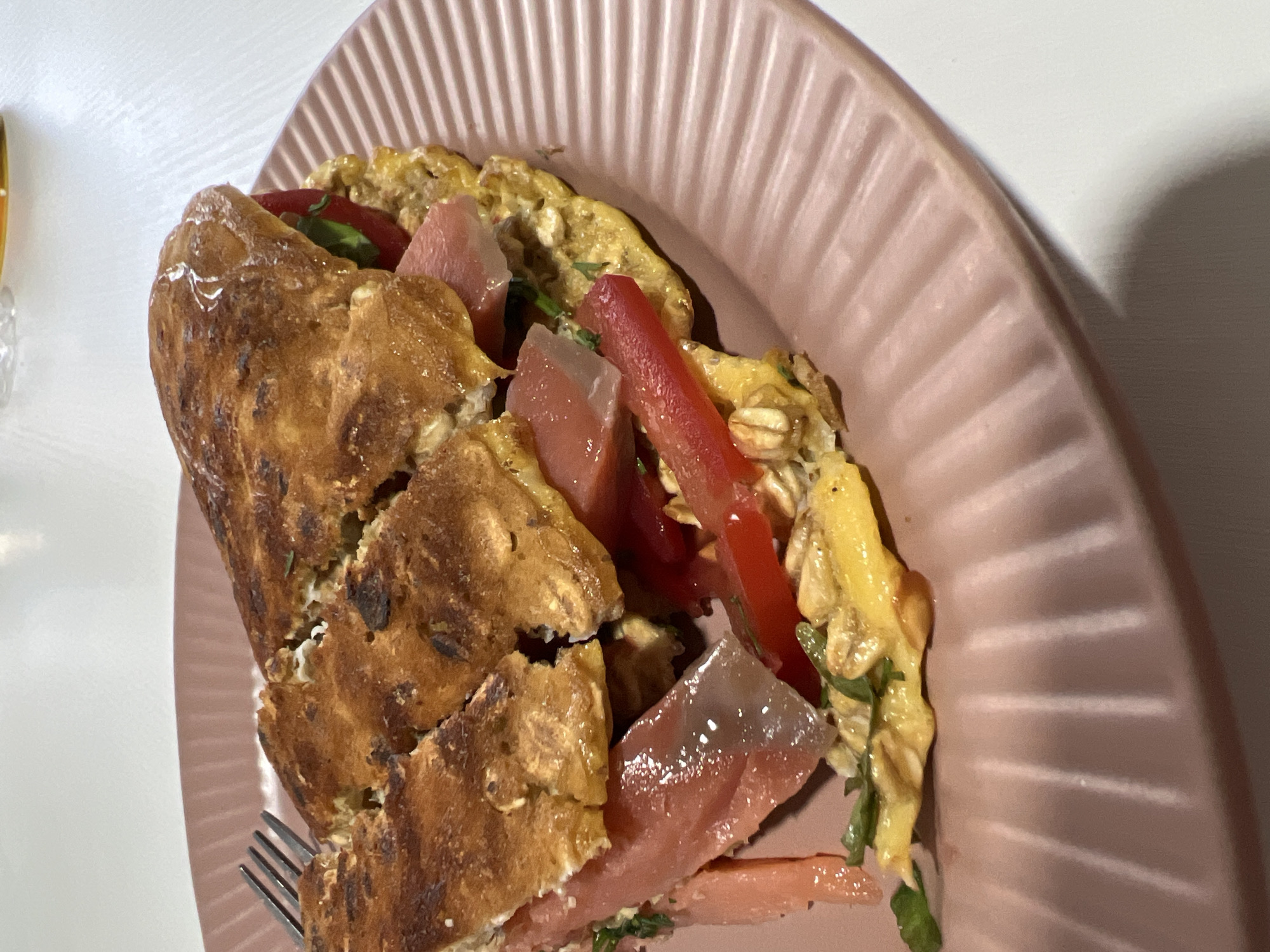 A partially eaten dish sits on a pink plate with a ridged design. The dish appears to be an open-faced sandwich or omelet of some sort, containing ingredients such as scrambled eggs, red peppers, green leafy vegetables (possibly spinach or arugula), and translucent, pinkish meat slices that could be salmon or ham. A fork is visible near the bottom left edge of the plate. The plate rests on a white surface. The location is not discernible from the visual information provided.