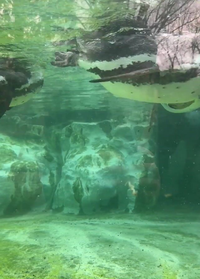 The camera is underwater, looking up at several penguins swimming near the surface of the water. The penguins are black and white. They are swimming in a green-tinged water. Below them, there is a rock formation, also partially covered in green growth. Above the surface of the water, trees and sky are visible, somewhat distorted by the water. One penguin swims very close to the camera.