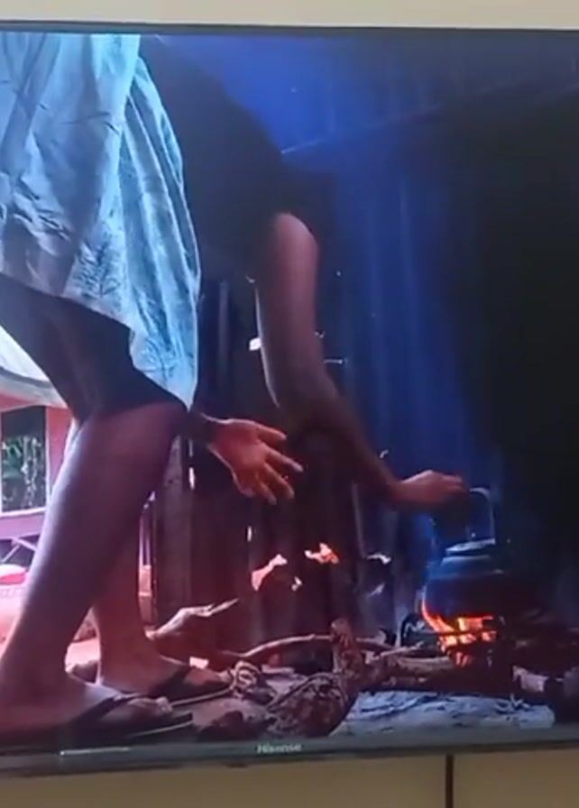 A person, clad in a black shirt and a light blue skirt, is tending to a fire that is burning under a black pot, as seen on a Hisense television screen mounted on a wall. The person is wearing brown sandals and their bare legs are visible beneath the skirt. The fire is burning outside of what appears to be a crude, makeshift shelter constructed from sticks and dark material, possibly corrugated metal. In the background, slightly out of focus, is a small house with a light pink facade, a green door, and a barred window. A pile of light-colored material or sacks lies next to the house. The lighting is bright outdoors, but the area around the fire is darker, with a blue-toned light illuminating the smoke. The screen displays a yellow sticker on the top right corner and is otherwise unadorned.