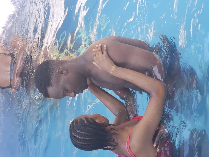 The image depicts three individuals partially submerged in a bright blue swimming pool. In the foreground, a man and a woman, both with dark skin tones, are positioned facing each other. The woman on the left wears a red swimsuit top and has dark braided hair; her forearms are resting on the man's shoulders/upper arms, with her hands on his upper arms. The man on the right, shirtless with a short dark haircut, has a faint yellow band on his left wrist and is looking towards the woman. Their torsos are visible above the water, which is at approximately mid-chest level for both. Their arms are engaged in an embrace. In the background, a third individual, seen from behind, is partially submerged with their head and shoulders visible, wearing a dark swimsuit top. The water is rippled, indicating movement. The specific location within Asaba, Nigeria is not discernible from the visual information presented.